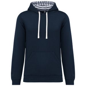 Gefütterte Kapuze mit spezifischem Stoff aus bedrucktem Baumwolljersey und kontrastfarbene Zugkordel.